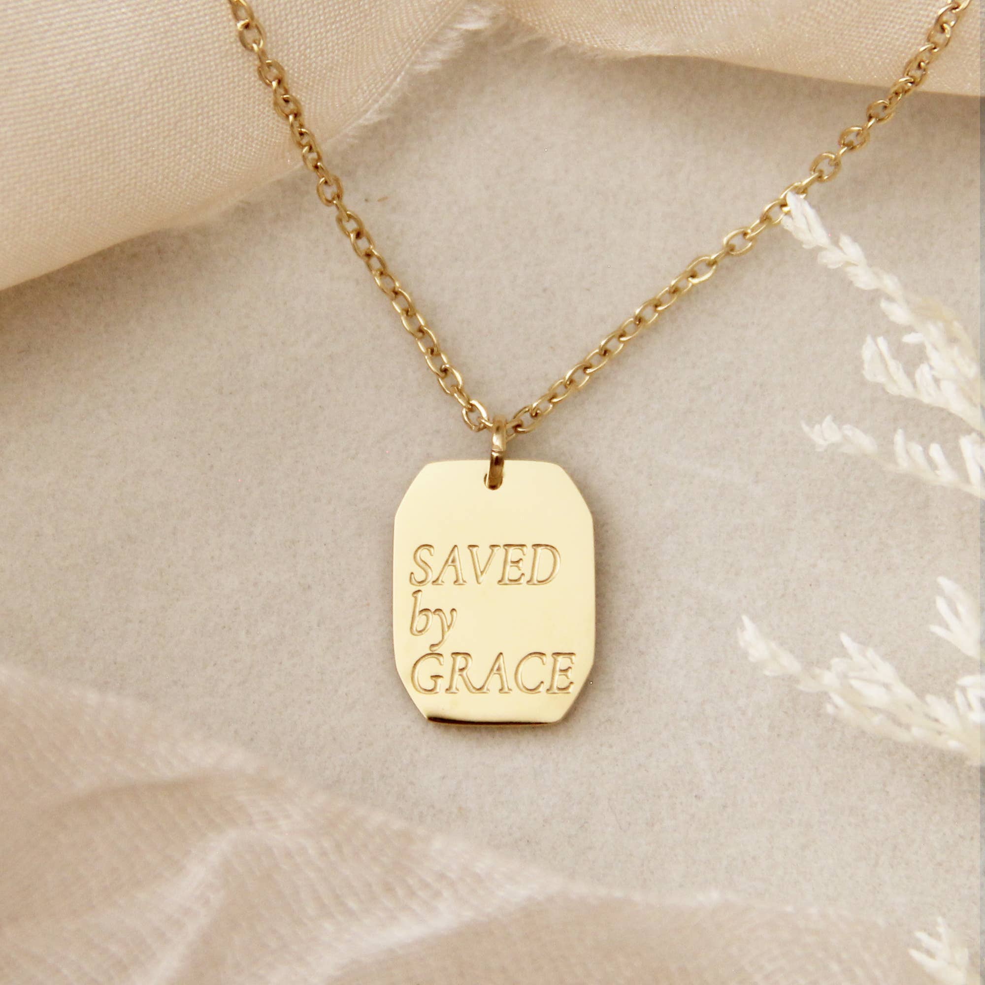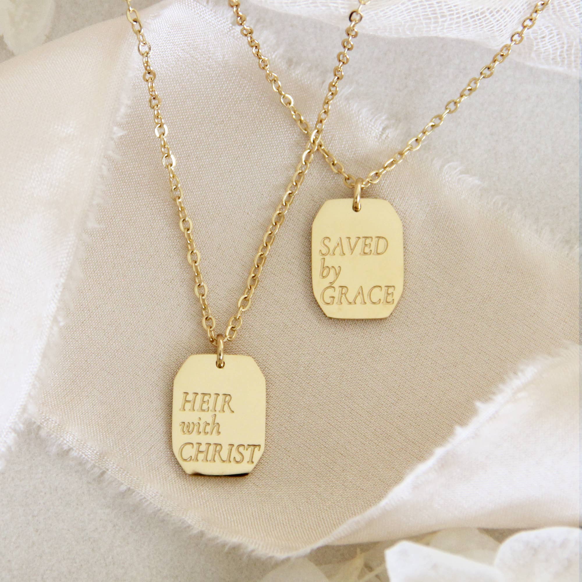 "For by grace you have been saved through faith. And this is not your own doing; it is the gift of God" Ephesians 2:8 • This listing is for one (1) necklace that is engraved front and back. Shown with our "Heir with Christ" • Lengths: 17" + 2" extender. Lengthens up to 19" • Measurements: 14mm x 10mm charm • Finish: 18K gold over surgical or polished surgical steel. Tarnish resistant and waterproof. • Nickel Free and Lead Free. Hypoallergenic. • All our jewelry is packaged in signature LoveStory Collection by MAIVE gift box.