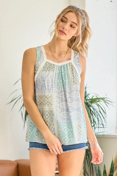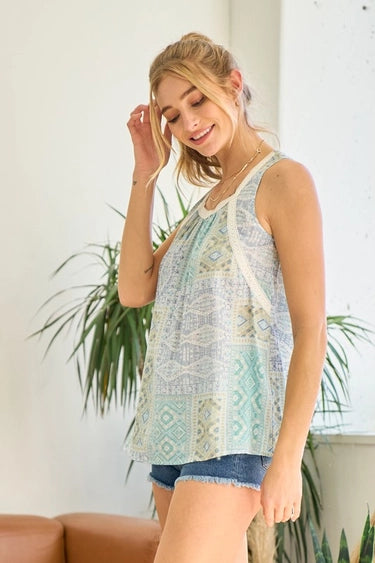 BLUE & GREEN BOHO LACE FLOWY PATCHWORK PRINTED TOP